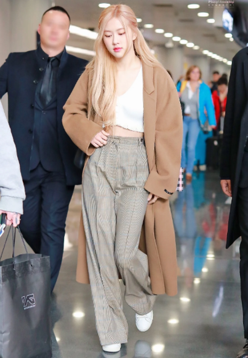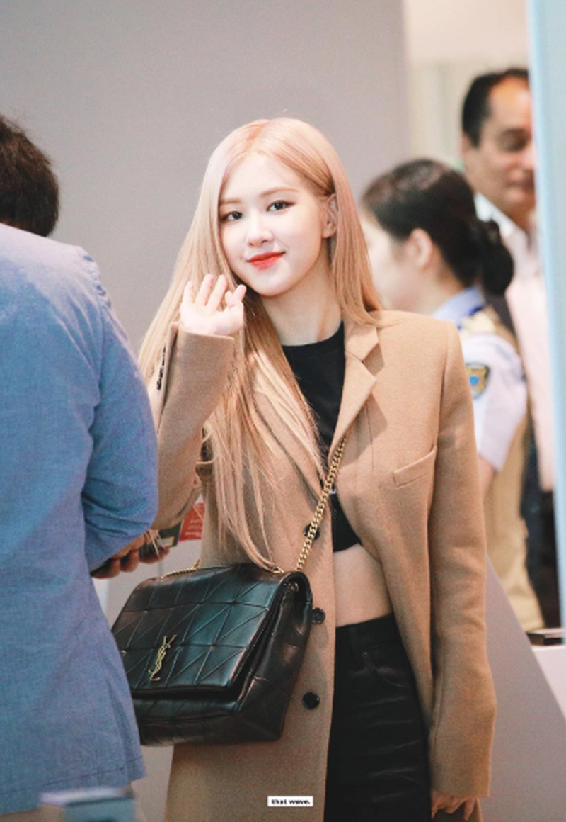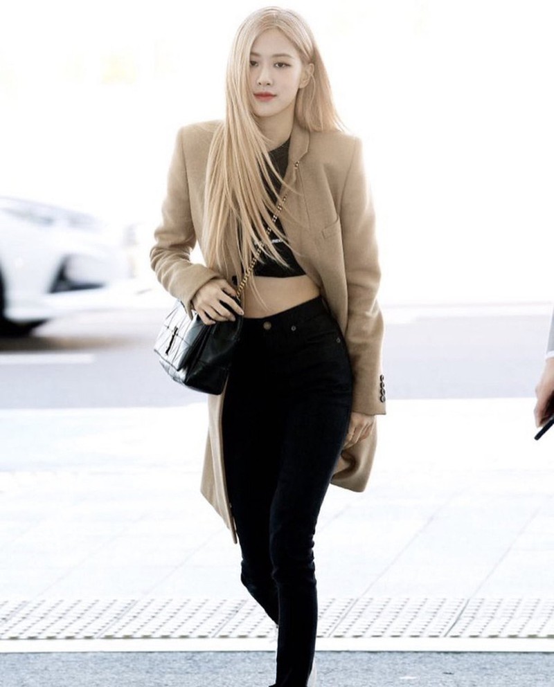 Rosé BlackPink diện áo dạ màu da hợp với màu tóc và nổi bật hơn khi kết hợp cùng túi xách đen |