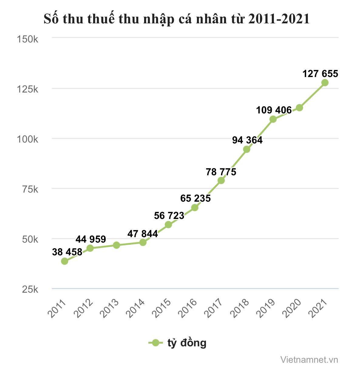 Số thu về thuế thu nhập cá nhân từ tiền lương, tiền công luôn tăng qua từng năm. Thu thuế thu nhập cá nhân tăng từ mức gần 38.500 tỷ đồng (2011) lên trên 127.600 tỷ đồng đúng 10 năm sau (xem biểu đồ).