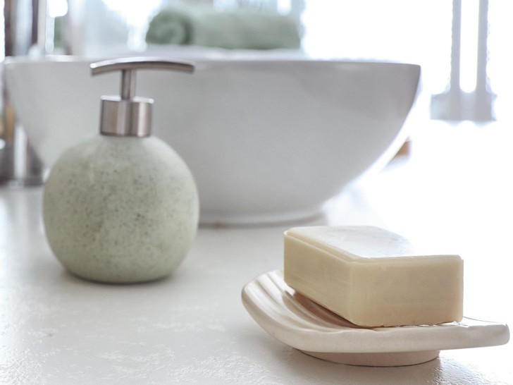 Để thuận tiện, hãy sử dụng xà phòng lỏng có vòi bơm hoặc bình đựng xà phòng gắn trên tường. Điều này sẽ giúp bạn không phải lau đĩa xà phòng bẩn hoặc mặt bàn vài ngày một lần.