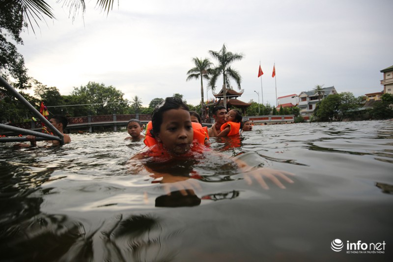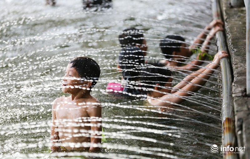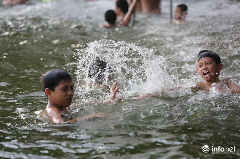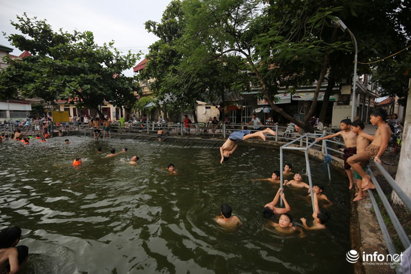 Cũng theo người dân, việc có 1 không gian bơi lội miễn phí đã thu hút hàng vạn người kéo đến. Có những ngày nắng nóng cao điểm tại "bể bơi" miễn phí này đón tiếp cả nghìn người. Như những ngày nắng nóng vừa qua thì có lúc ao làng phải có đến 500 người bơi lội cùng 1 lúc. |