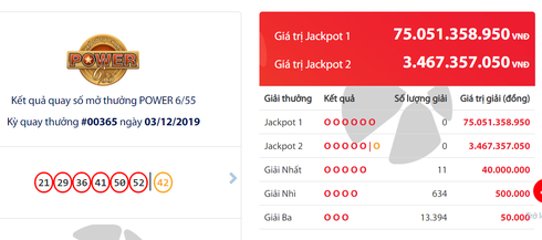 Kết quả xổ số Vietlott Power 6/55 tối 3/12, Vietlott vẫn chưa tìm ra chiếc vé may mắn nào trúng giải Jackpot 1 có trị giá hơn 75 tỷ đồng. |