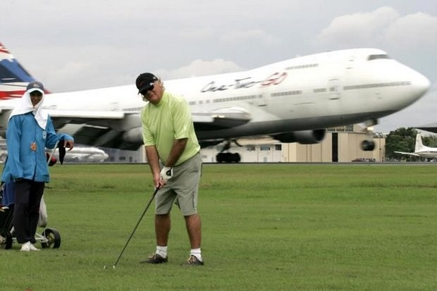 Sân bay Don Mueang là một sân bay quân sự và thương mại ở Bangkok với một đặc điểm cực kỳ độc đáo nằm ngay giữa đường băng của nó là một sân Golf. Nhìn từ xa Don Mueang International giống như bất kỳ sân bay hạng trung nào khác. Tuy nhiên, điều đặc biệt là ở giữa hai đường băng có một sân Golf 18 lỗ. Bạn sẽ cảm thấy thế nào khi đánh một quả bóng Golf chỉ cách đường băng 20m. Chụp ảnh và quay video bị nghiêm cấm ở đây và mọi người chơi đều được hộ tống bởi một caddie. Bạn thậm chí phải đi qua một cổng an ninh bằng kim loại để vào sân.