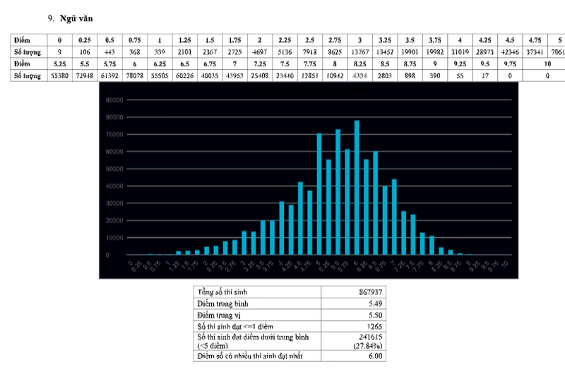 Có 241.615 thí sinh có điểm dưới trung bình ở môn thi này, chiếm 27,84%; 1.265 thí sinh bị điểm liệt (từ 1 điểm trở xuống);