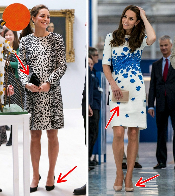 Kate hiếm khi mặc đồ lòe loẹt như hình da báo. Nhưng nếu khoác lên người những món đồ như vậy, để không khiến vẻ ngoài trở nên quá lòe loẹt, cô thêm các phụ kiện trung tính. Ví dụ, vào năm 2015, khi cô mang bầu, cô đã diện một chiếc váy in họa tiết bắt mắt, ví đen và giày đơn giản.