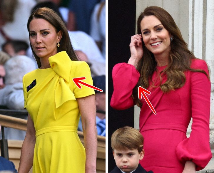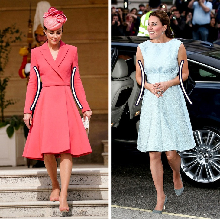 Vì Kate Middleton cao và gầy, nên để cân đối tỷ lệ cơ thể, cô thường xuyên diện những bộ đồ cạp cao. Và để tạo độ phồng cho hai bên hông, cô sử dụng kiểu xếp nếp phù hợp: nếp gấp gần bụng.
