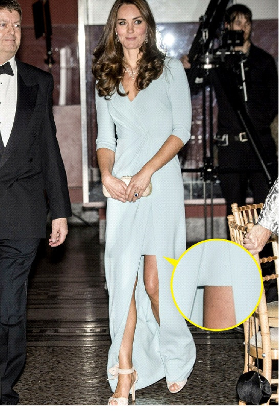 Năm 2014, Kate đã đến thăm buổi dạ tiệc tại một bảo tàng. Cô mặc một chiếc váy màu ngọc bích nhạt với đường cắt xẻ cao. Để không phản cảm, công nương đã mặc thêm một chiếc váy quây bên trong.