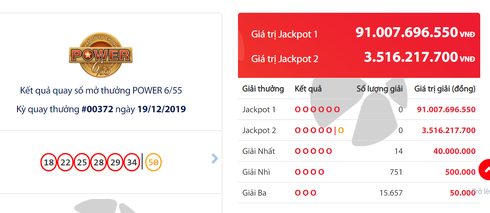 Kết quả xổ số Vietlott Power 6/55 tối 19/12 cho thấy, Vietlott vẫn chưa tìm ra chiếc vé may mắn nào trúng giải Jackpot 1 có trị giá hơn 91 tỷ đồng. |