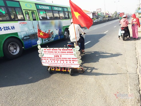 Anh cho xe chạy từ từ, chậm rãi. Phía sau, nhiều xe bị cản không vượt qua được nhưng không một ai bày tỏ khó chịu, bởi vì sau chiếc khung sắt anh kéo là tấm biển ghi rõ: 'Xe hút đinh tự nguyện - hãy chung tay vì cộng đồng'.