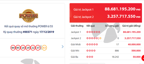 Kết quả xổ số Vietlott Power 6/55 tối 17/12 cho thấy, Vietlott vẫn chưa tìm ra chiếc vé may mắn nào trúng giải Jackpot 1 có trị giá hơn 88 tỷ đồng. |