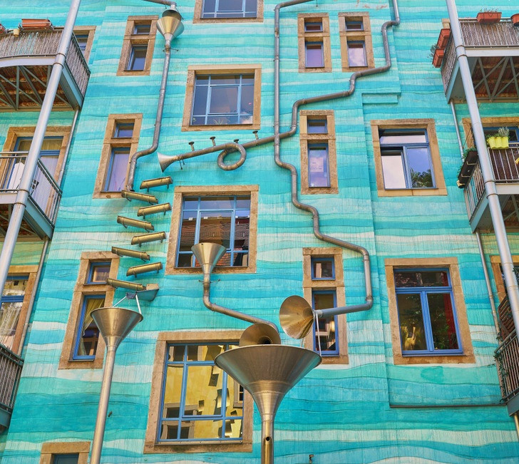 Nằm trong Neustadt Kunsthofpassage, một khu sáng tạo ở Dresden, bức tường này chắc chắn là một điểm thu hút đáng để bạn dành thời gian. Những người sáng tạo ra nó, Annette Paul, Christoph Roßner và André Tempel đã biến bức tường này trở thành một điểm du lịch. Bức tường như thể hiện một vở nhạc kịch. Người ta nói rằng bất cứ khi nào mưa chạm vào các phễu, nó tạo ra một giai điệu tuyệt đẹp.