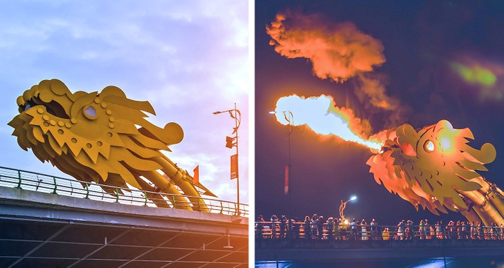Cây cầu có một con rồng chạy dọc theo toàn bộ chiều dài của nó, không chỉ là một bức tượng bằng sắt và bê tông đơn thuần. Nó được thực hiện theo kiểu rồng thực sự, nó có thể phun được lửa và nước, thậm chí có thể thay đổi màu sắc vào ban đêm.