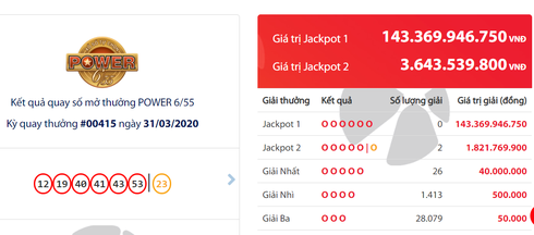 Hiện nay, ngoài Jackpot 1 của loại hình xổ số Power 6/55 có giá trị hơn 143 tỷ đồng và Jackpot 2 quay về 3 tỷ đồng; còn Jackpot của loại hình xổ số Mega 6/45 giá trị hơn 14 tỷ đồng vẫn đang đợi người chơi may mắn tiếp theo.