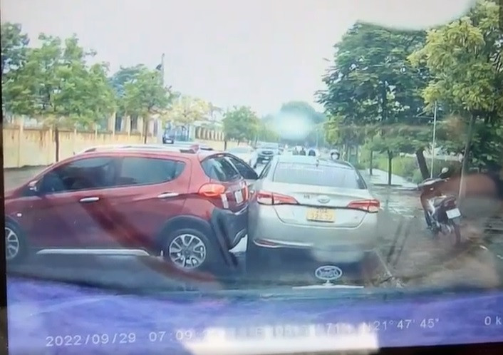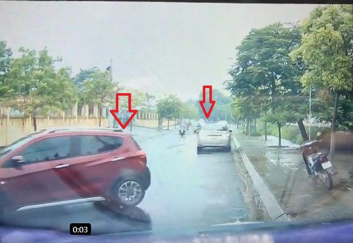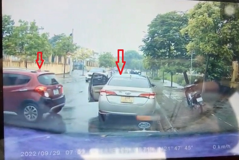 Theo đó, 1 chiếc xe ô tô 5 chỗ màu đỏ đang quay xe để đỗ cùng chiều với xe có camera hành trình. Khi chiếc xe ô tô đỏ đang tiến vuông góc với lề đường thì ở phía trước chiếc xe ô tô màu bạc đã lùi lại đỗ đúng chỗ chiếc xe ô tô màu đỏ định lùi vào.
