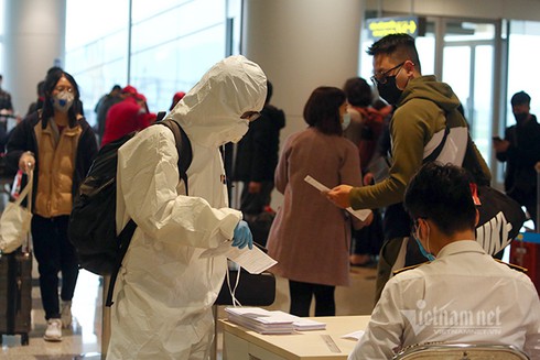 Công dân Việt Nam từ nước ngoài làm thủ tục khai báo y tế tại sân bay Nội Bài |