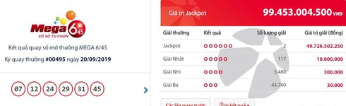 Theo đó, tại kỳ quay số mở thưởng thứ 495 loại hình xổ số Mega 6/45 diễn ra tối 20/9, Vietlott đã tìm ra được 2 chiếc vé có các số trùng khớp với 6 cặp số của giải độc đắc Jackpot trị giá 99.453.004.500 đồng.
