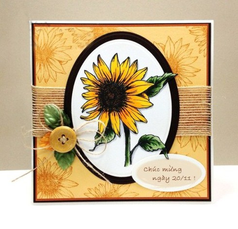 Cuối cùng,dùng 3 lớp xốp dán để dán cho phần nền thiệp cao lên khỏi hai khung dán trên bìa thiệp. Dán bông hoa hướng dương lên nền thiệp, bạn có thể trang trí thêm chút hạt cườm xếp uốn lượn hai góc thiệp đối xứng. Tất nhiên không thể thiếu lời đề tặng ghi trên một dải giấy nhỏ dán kèm theo thiệp rồi!