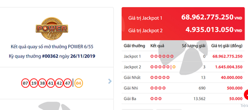 Tại kỳ quay số mở thưởng thứ 362 loại hình xổ số Power 6/55 diễn ra tối 26/11, Công ty Xổ số điện toán Việt Nam (Vietlott) đã bất ngờ tìm ra 3 chiếc vé của những người chơi may mắn trúng giải Jackpot 2, trị giá 4.935.013.050 đồng.