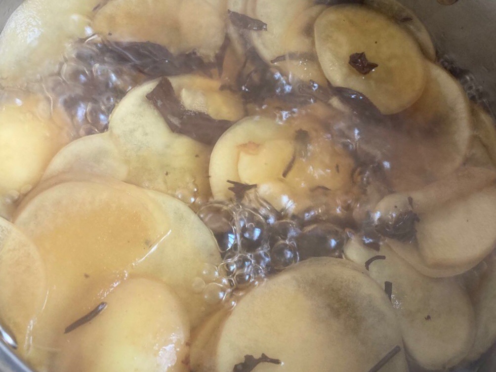 Tiếp đó, bạn cho táo, trà đen và 1 lít nước vào nồi, đun sôi trong vòng 20 phút.