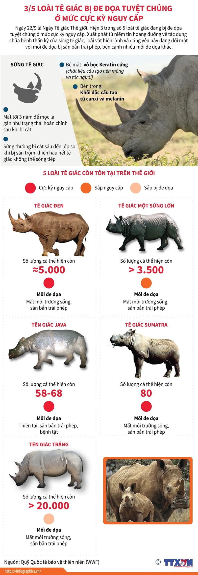 Ngày 22/9 là Ngày Tê giác thế giới. Hiện ba trong số năm loài tê giác đang bị đe dọa tuyệt chủng ở mức cực kỳ nguy cấp.
