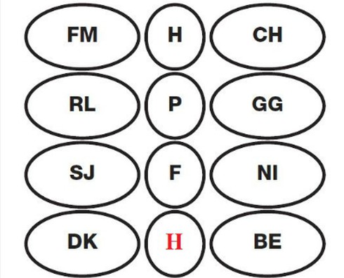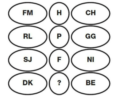 Câu 1: Hãy tìm ra quy luật để điền chữ thích hợp vào dấu hỏi chấm trong hình dưới đây.