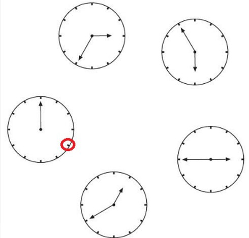 Câu 3: Một chiếc đồng hồ trong hình dưới đây thiếu kim giờ. Hãy tìm quy luật giữa năm chiếc đồng hồ để chỉ ra kim giờ ở chiếc đồng hồ đó chỉ vào số mấy?