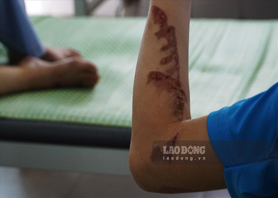 Trên lưng, mặt, tay, chân... đều là những vết thương do bị chủ quán bánh xèo ở Bắc Ninh tra tấn hơn 1 tháng nay. (Ảnh: Tùng Giang) |