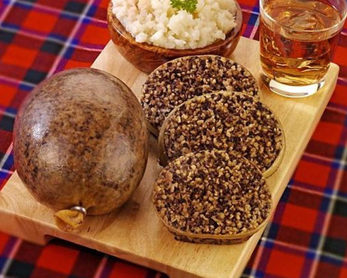 Haggis là một món ăn truyền thống của Scotland. Nó là một món hổ lốn gồm nhiều nội tạng khác nhau như tim, gan, phổi cừu, kết hợp với hành tây, bột yến mạch, gia vị, sau đó cho vào dạ dày cừu và buộc chặt lại.