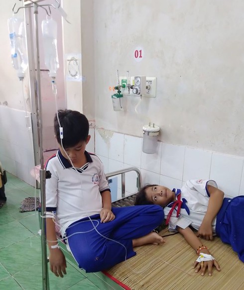 Trong số 45 học sinh nhập viện sau khi súc miệng flour ở Cà Mau có 17 học sinh nôn ói, đau bụng, khó chịu, phải truyền nước.