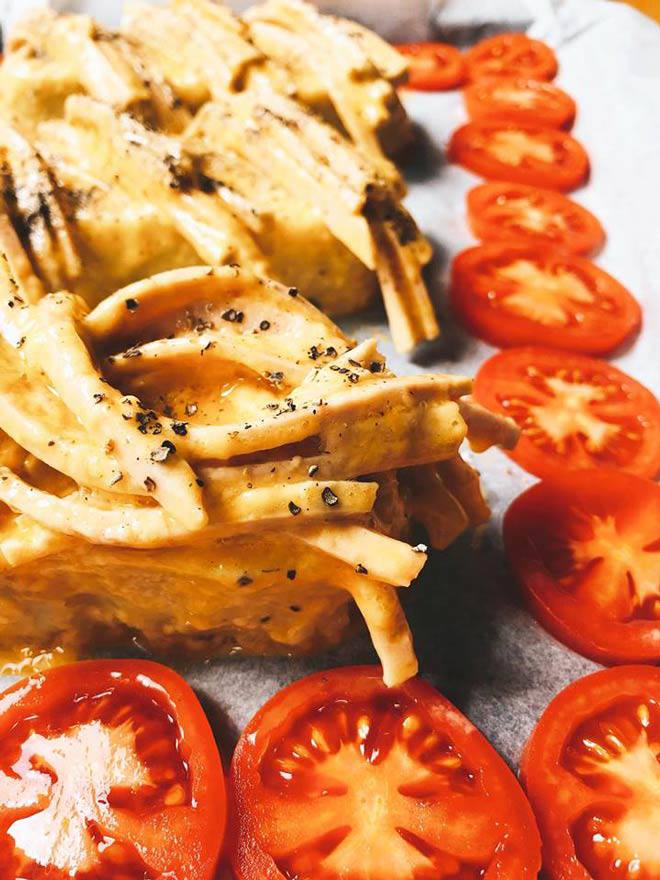- Lấy một khoanh bánh chưng lăn qua bột mì cho phủ đều, nhúng vào tô trứng. Tương tự chả lụa cũng làm như vậy. Tiếp tục trang trí chả lụa lên bánh chưng theo ý thích, rắc hạt tiêu lên trên. Làm nóng lò ở mức 200 độ, cho bánh chưng nướng trong lò khoảng 30 phút. Khi nướng bánh chưng khoảng 25 phút thì lấy bánh chưng ra phết một lớp bơ mỏng rồi cho vào nướng tiếp 15 phút nữa (giúp bánh chưng nướng giòn và béo thơm hơn).