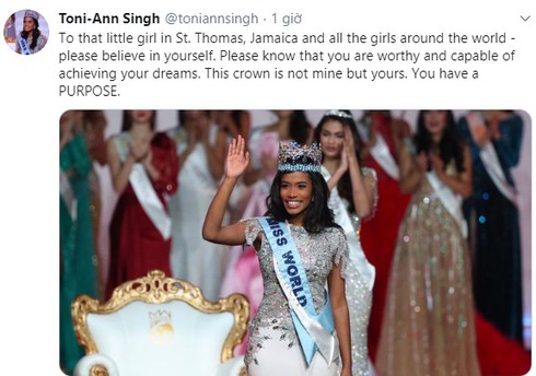 Sau khi kết thúc đêm chung kết Hoa hậu thế giới 2019, Toni-Ann Singh chia sẻ niềm vui trên Twitter cá nhân hình ảnh đăng quang cùng lời nhắn: "Gửi đến cô gái nhỏ ở St. Thomas, Jamaica và tất cả các cô gái trên khắp thế giới - xin hãy tin vào chính mình. Hãy biết rằng bạn xứng đáng và có khả năng đạt được mọi ước mơ của bạn. Vương miện này không phải của tôi mà là của bạn".