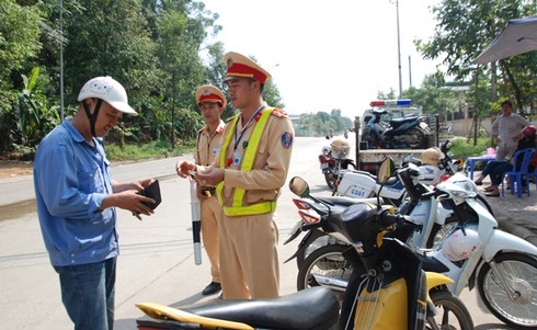 Lực lượng CSGT tỉnh Lào Cai kiểm tra người điều khiển phương tiện giao thông. |