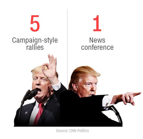 Tổng thống Trump mới chỉ tổ chức họp báo đúng 1 lần trong khi đã gặp người ủng hộ tới 5 lần ở 5 bang. Nguồn: CNN |