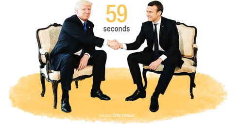 Ông Trump đã gặp gỡ với rất nhiều lãnh đạo nước ngoài trong 6 tháng đầu tiên của mình nhưng cuộc gặp với Tổng thống Pháp Emmanuel Macron là được chú ý đặc biệt. Trong 6 lần “tương tác” tại các cuộc họp ở Brussels, Bỉ và gần đây là tại thủ đô Paris, hai nhà lãnh đạo đã dành tới gần một phút để bắt tay.