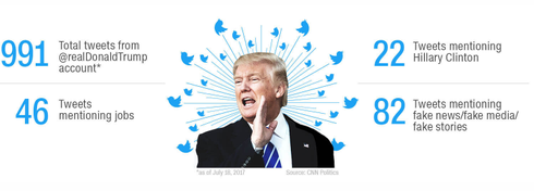 Từ khoảnh khắc tuyên thệ nhậm chức ngày 20/1, tài khoản Twitter @realDonaldTrump đã tweet tổng cộng 991 lần. Những từ ngữ, chủ đề mà ông Trump nhắc đến nhiều nhất gồm “fake news” (tin tức giả), truyền thông hay “stories” được nhắc đến 82 lần, “jobs” (việc làm) là 46 lần xuất hiện và “Hillary Clinton” khoảng 22 tweet. Ngoài ra, cựu Tổng thống Obama cũng được ông Trump nhắc tên 36 lần và từ “Obamacare” xuất hiện trong 45 bài đăng trên Twitter của ông Trump.
