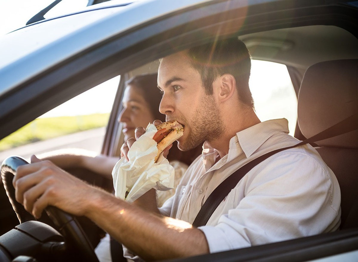 Không nên ăn vặt khi lái xe. Tốt hơn hết là người lái xe không nên phân tâm trên đường do ăn vặt. “Nếu một người nhai một thứ gì đó nguyên vẹn (chẳng hạn như một thanh sô cô la) thì ít bị ảnh hưởng. Nhưng nếu bạn liên tục cho tay lấy đồ sẽ rất nguy hiểm khi không tập trung lái xe. Ngoài ra, nếu đồ ăn bị rơi mà bạn cúi xuống nhặt sẽ rất nguy hiểm khi bạn không nhìn đường.