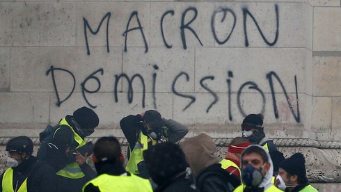 Dòng chữ "Macron hãy từ chức" được sơn trên một góc của Khải Hoàn Môn trong lúc cuộc biểu tình Áo Vàng diễn ra quyết liệt. |