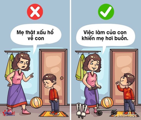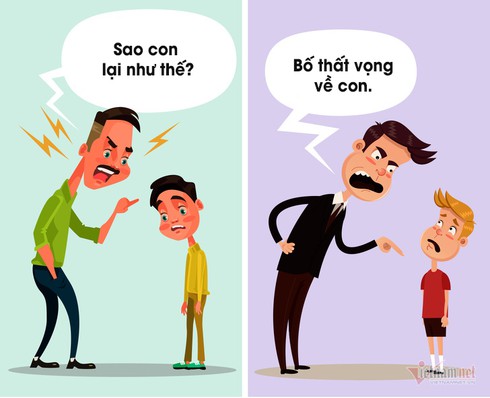 Thay vì nói câu: “Bố mẹ rất thất vọng về con!”, cha mẹ hãy thử nói: “Bố mẹ cảm thấy rất buồn về việc con đã làm, vì ...” để thay đổi suy nghĩ của trẻ nhỏ.