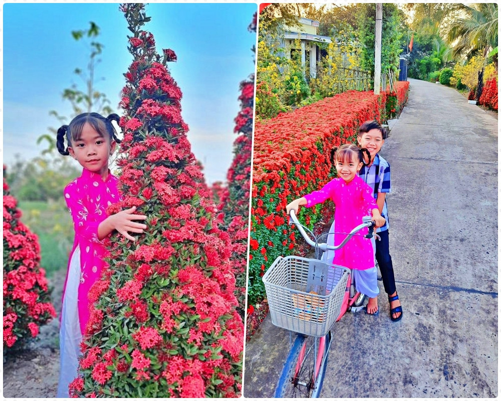 Ngoài dãy bông trang rực rỡ, thẳng tắp theo con đường làng, Phước còn trồng thêm rất nhiều gốc bông trang đỏ được tạo dáng cây thông đẹp mắt. Do nhà sát đường quốc lộ, dịp Tết vừa qua, Phước đón nhiều lượt khách hiếu kỳ đến chụp ảnh, ngắm bức tường hoa của mình.