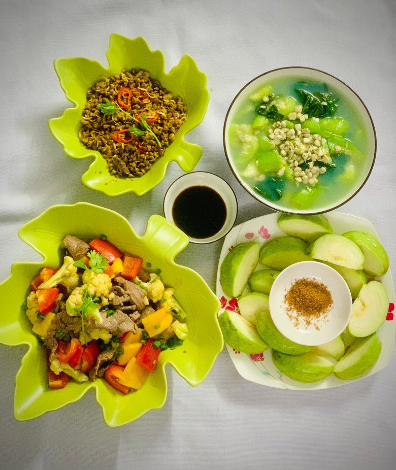 Dù rẻ hay đắt tiền nhưng bữa bào chị Trang cũng sẽ chuẩn bị 1 món mặn, 1 món canh và 1 món rau. Rau xanh rất tốt cho sức khoẻ nên hầu như mỗi ngày nhà chị đều có 1 đĩa rau to kèm trái cây các loại. Chị cho biết, bản thân luôn ưu tiên chọn mua từ những nguồn thực phẩm đồng quê cho tươi ngon, sạch và giá cả phải chăng. Riêng trái cây bà mẹ đảm sẽ mua theo mùa như vậy sẽ đảm bảo an toàn vệ sinh thực phẩm hơn.