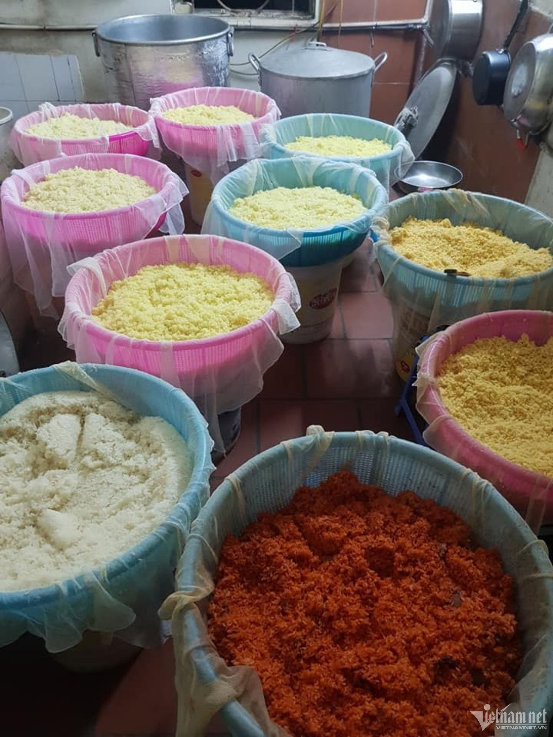 Ngày thường, anh Hoàng bán đủ loại từ xôi xéo, xôi lạc, xôi ngô, xôi gấc, xôi đậu xanh… Ngày lễ Tết, anh bán thêm rượu nếp, xôi ngũ sắc, bánh trôi, bánh chay... Giá bán trung bình là 10.000 đồng/gói xôi. Ai thích ăn thêm thịt, trứng, chả thì mỗi gói tầm 15.000 - 20.000 đồng.