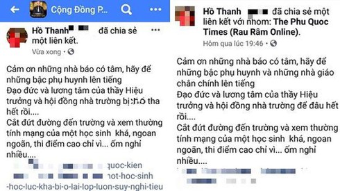 Mấy ngày gần đây, dư luận xôn xao khi một tài khoản Facebook có tên là H.T.H. đã đăng tải trên trang Facebook Cộng đồng Phú Quốc dòng trạng thái có lời lẽ miệt thị Hiệu trưởng và Hội đồng giáo viên một trường cấp 3 ở Phú Quốc vì đã để con bà phải lưu ban do nghỉ quá số ngày quy định.