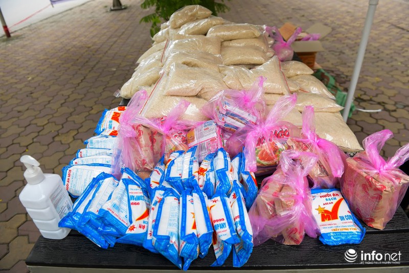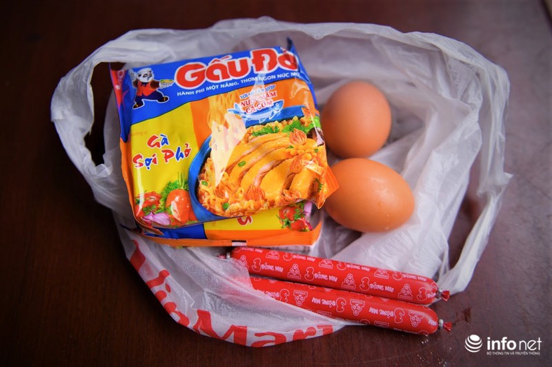 Mỗi túi thực phẩm hỗ trợ người nghèo gồm có: 2 gói mì tôm, 2 quả trứng, 2 thanh xúc xích đủ cho 1 người ăn 1 ngày. Người dân cũng có thể chọn suất gồm có 1 cân gạo và 1 túi muối ăn. |