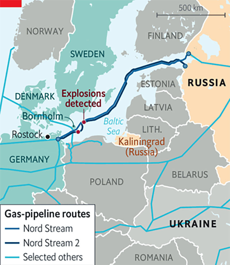 Sáng 26/9/2022, thiết bị giám sát của Đan Mạch đã phát hiện một cơn địa chấn tương đương sức công phá của 500kg thuốc TNT gây ra ở phía đông nam đảo Bornholm. Cùng lúc đó, việc giảm áp suất được ghi nhận ở Dòng chảy phương Bắc 2, tuyến phía nam của hai đường ống song song, được thiết kế để vận chuyển khí đốt của Nga dưới biển Baltic.