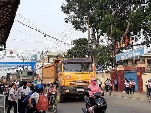 Xe ben chạy rầm rập, nối đuôi nhau qua cổng trường cấp 2 gây nguy hiểm cho các em học sinh trong giờ tan tầm. |