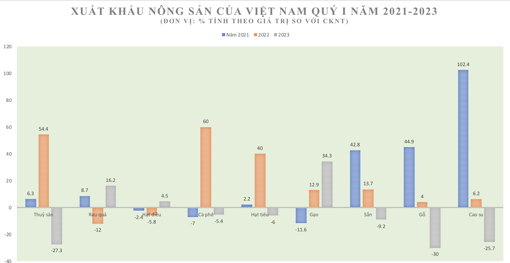 Theo báo cáo của Trung tâm Chuyển đổi số và Thống kê Nông nghiệp (Bộ NN-PTNT), tính đến hết quý I/2023, kim ngạch xuất khẩu toàn ngành nông nghiệp đạt 11,19 tỷ USD, giảm 14,4% so với cùng kỳ năm 2022. Trong đó, giá trị xuất khẩu nhiều mặt hàng chủ lực giảm mạnh như: gỗ và sản phẩm gỗ, cao su, sắn và sản phẩm sắn, thuỷ sản...