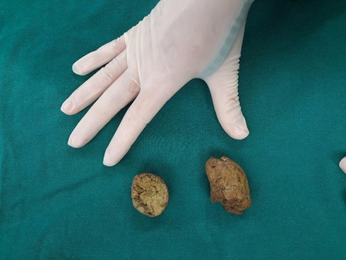 Ca phẫu thuật kéo dài 2 giờ đồng hồ, các bác sĩ cho biết trong ổ bụng bệnh nhi có nhiều dịch, các quai ruột non giãn to, có khối bã thức ăn kích thước 2x3cm cứng chắc làm bít tắc hoàn toàn lòng ruột, phía trên chỗ bít tắc có nhiều bã thức ăn kích thước nhỏ hơn, kiểm tra dạ dày có 2 khối bã thức ăn kích thước 3x3cm. Tiến hành xử trí bóp nhỏ bã thức ăn, tuồn dịch và các bã thức ăn trên chỗ tắc xuống đại tràng, mở dạ dày lấy 2 khối bã thức ăn sau đó rửa ổ bụng.