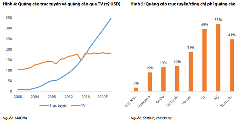 Chi phí quảng cáo trực tuyến/tổng chi phí quảng cáo tại Việt Nam vẫn còn rất thấp so với các quốc gia khác cũng như bình quân toàn cầu (hình dưới). Thống kê này cho thấy Việt Nam vẫn đang trong giai đoạn đầu phát triển của quảng cáo trực tuyến nên tiềm năng cho thị trường này còn rất lớn.