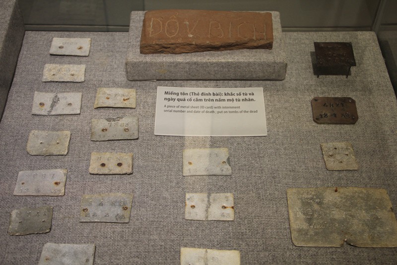 Miếng tôn (hay còn gọi là Thẻ đính bài) dùng để gắn số tù nhân và ngày quá cố cắm trên nấm mộ tù nhân |