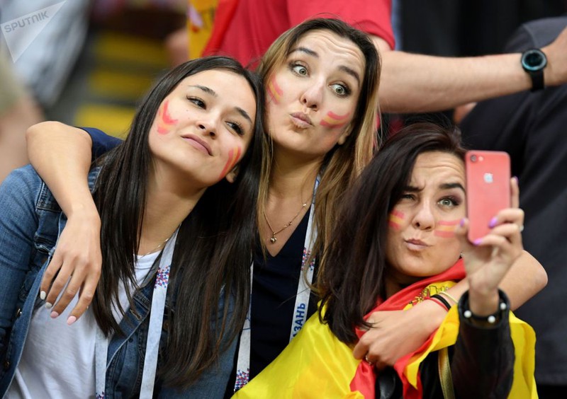 Fan nữ Tây Ban Nha tranh thủ chụp ảnh trước trận đấu giữa Tây Ban Nha - Iran. |