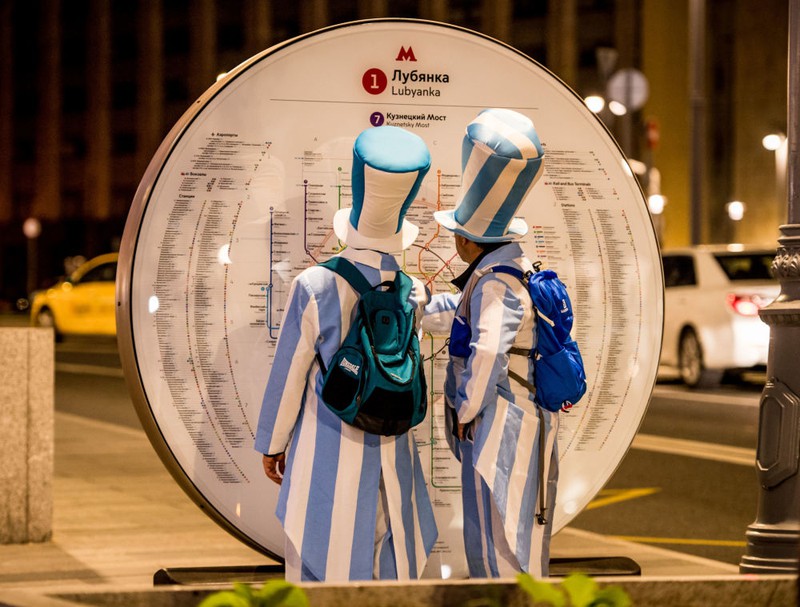 Cổ động viên Argentina xem sơ đồ tàu điện ngầm ở Nga. |